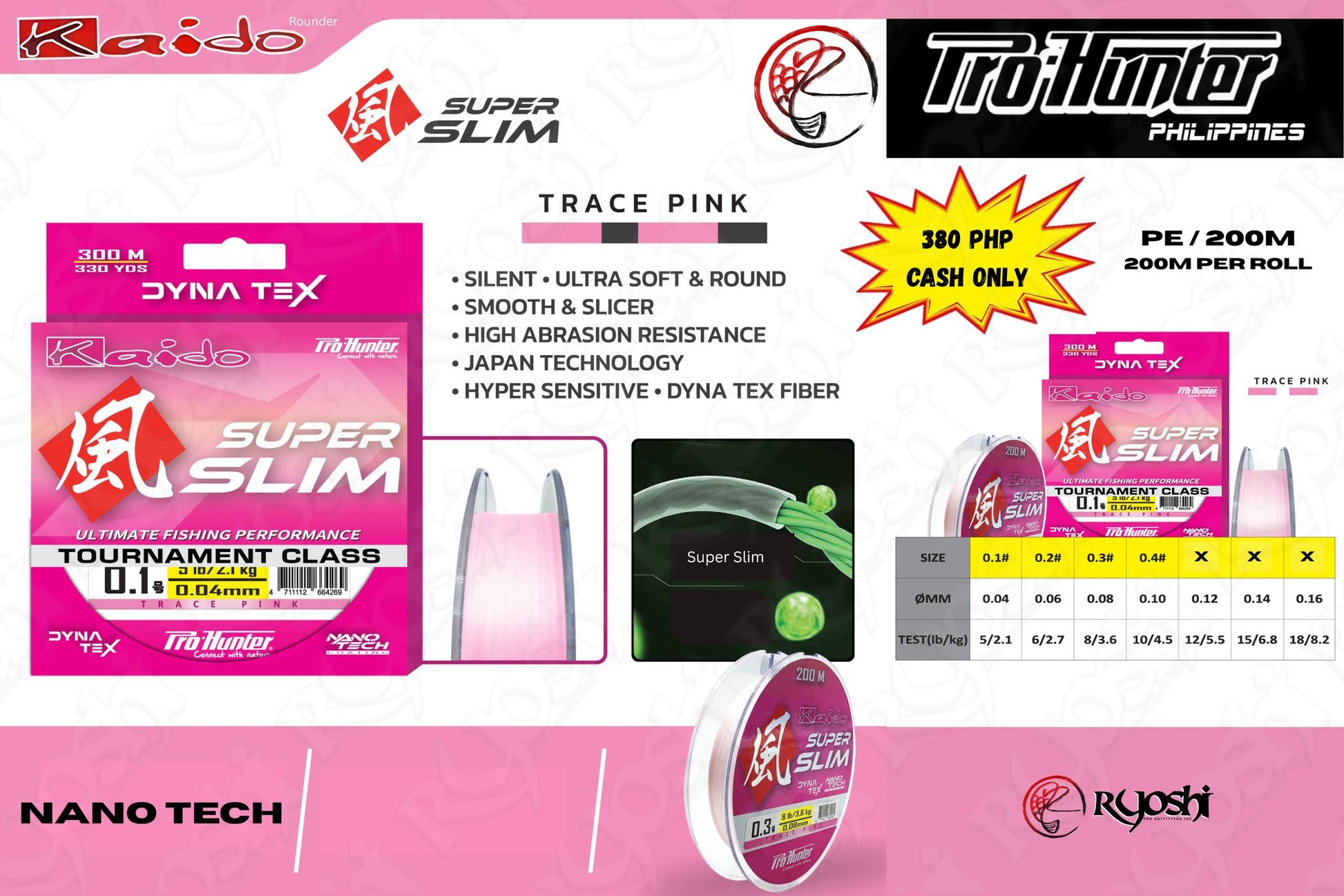 The Prohunter Kaido Super Slim braid is a super thin braid line made through nano technology, it has a medium tight weave which make it strong, water slicer, durable and highly abrasive resistant. It employs a tracer pink color coating which makes it less visible for fish on certain depth, this coating also makes the braid water resistant which enables the braid to sink faster. For finicky fishes like aji this braid is recommended because of its thin diameter which has less drag on the water.