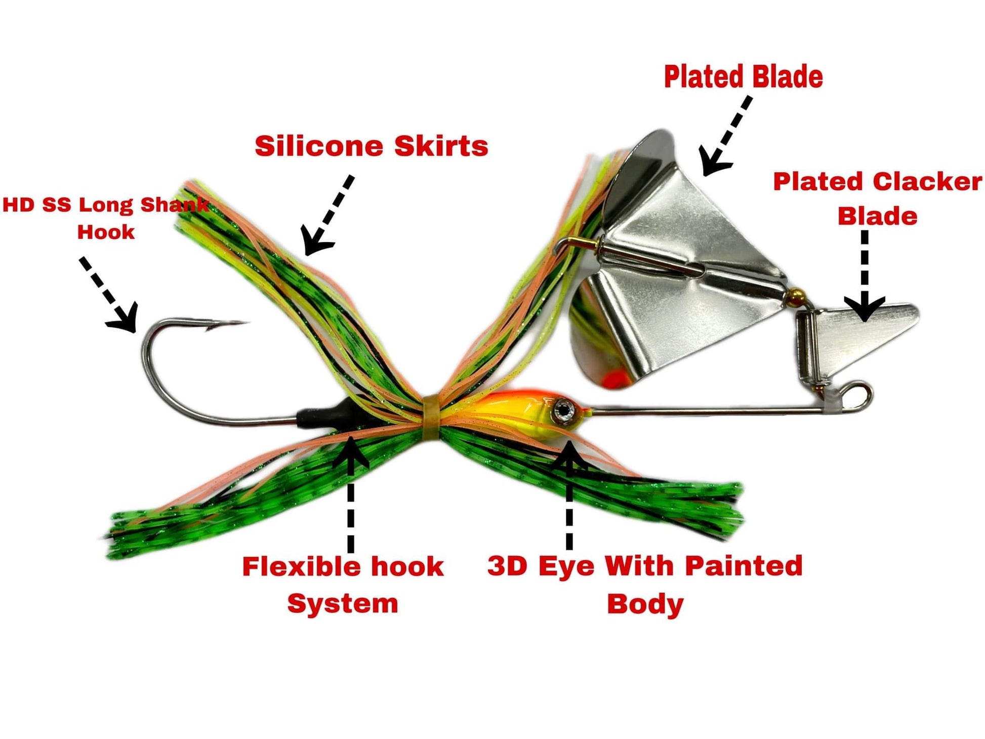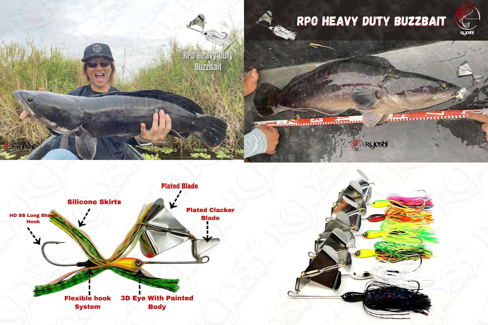 Buzzbaits are topwater fishing lures which derive their name from the buzzing sound and water disturbance they generate. Typically, anglers use buzzbaits in our region chasing big Toman (Giant Snakehead) and Sebarua (Jungle Peach) that feed on water's surface. Ryoshi Pro Buzzbaits feature a Flexible Hook connection so hook can be replace to larger size if needed and flexible hook connection also prevent the wire from bending during hook up and fighting the fish.